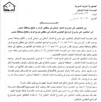 إعلان للمكتتبين على مشروع الادخار السكني في منطقتي الوعر وتلكلخ .